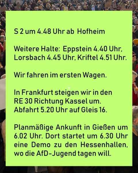 Die AfD-Jugend plant am 29. und 30. November in Gießen ihre Neugründung. Für dieses Wochenende wird bundesweit zu Protesten mobilisiert. Weitere Infos folgen.