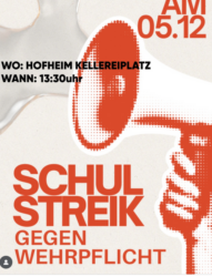 Bundesweit wird am Freitag, den 5.12., von Schülerinnen und Schülern gegen die beabsichtigte Wehrpflicht gestreikt. Auch im Main-Taunus-Kreis werden Schülerinnen und Schüler sich diesem Ansinnen anschließen. Eine zentrale Kundgebung für den Main-Taunus-Kreis wird in Hofheim ab 13.30 Uhr auf dem Kellereiplatz stattfinden.