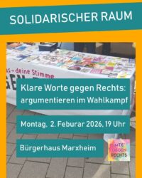 Im Solidarischen Raum geht es diesmal – am 2. Februar, 19 Uhr – um die Aktivitäten im Wahlkampf gegen Rechtsextremismus und Menschenfeindlichkeit. Wie können wir uns am Infotisch und bei Aktionen verhalten, ohne unnötig zu eskalieren; klare Worte finden und trotzdem (oder deswegen) auch Freude am solidarischen Argumentieren haben.